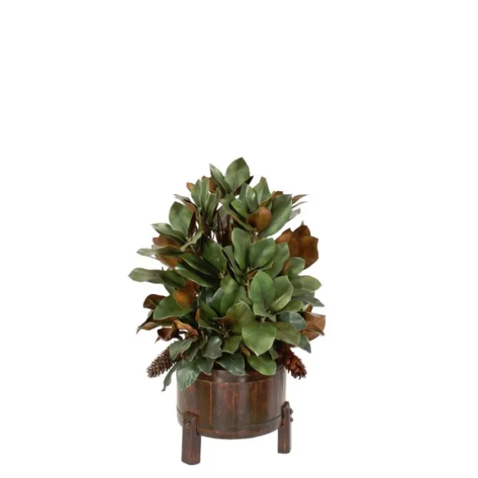 Luxury artificial Magnolia Foliage in Wooden Barrell Container. Item ships fully assembled and arrives as shown.