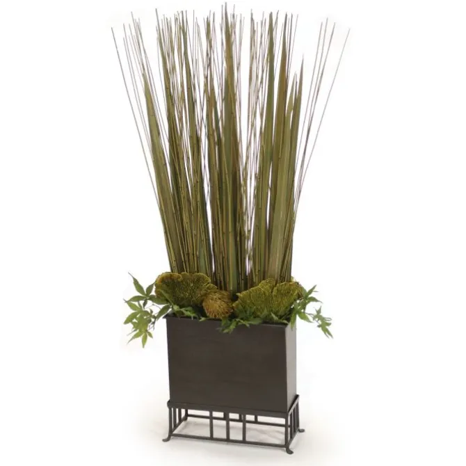 Luxury artificial Natural Grass Blades with Maple Branches and Reed and Baxtra and Mushrooms in Wooden Box with Stand. Item ships fully fluffed and assembled as shown.