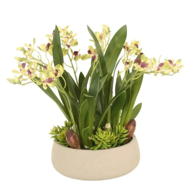 ORCHID WITH SUCCULENT AND GRASS IN GREY PLANTER