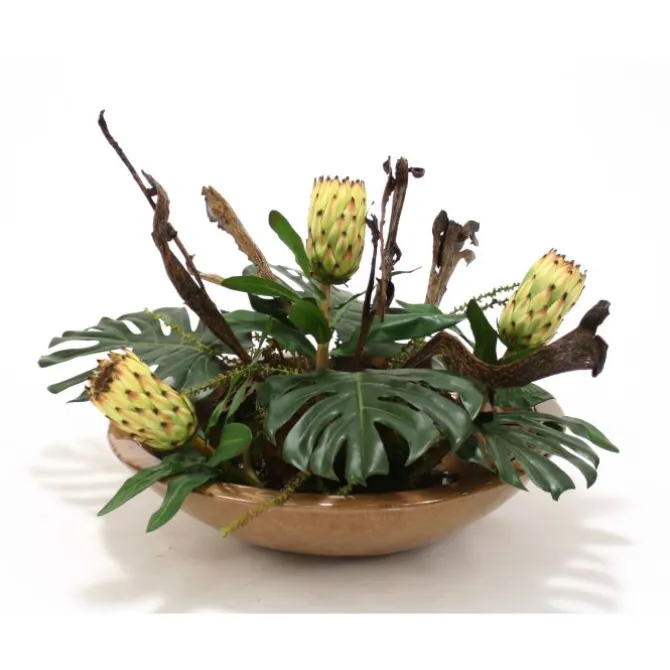 Luxury artificial Tropical Foliage with Proteas, Natrag and Pods in Mocha Glazed Bowl.