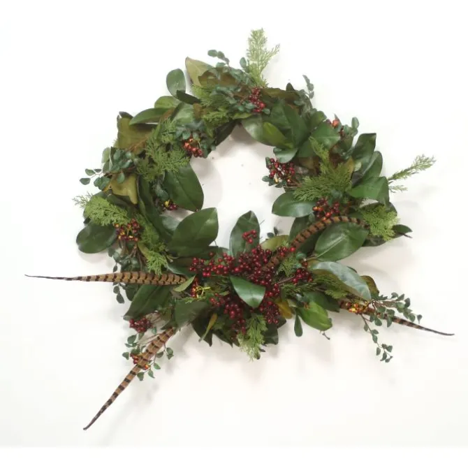 Luxury artificial 30″ Magnolia Foliage Wreath with Berries and Feathers. Item ships fully assembled and arrives as shown.