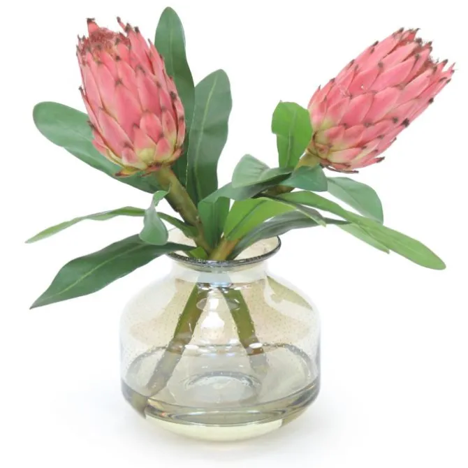 Luxury artificial Mauve Proteas in Amber Glass. Item ships fully fluffed and assembled as shown.