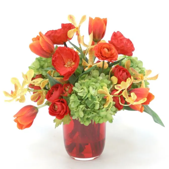 Luxury artificial Red Orange Tulip, Yellow Orange Vanda, Hydrangea, and Poppy in Glass Vase.