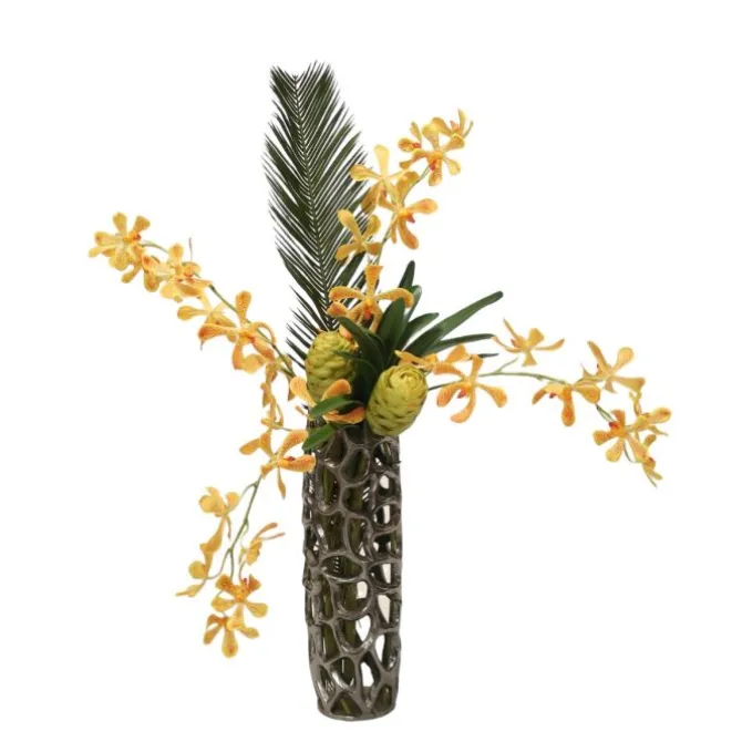 Luxury artificial Yellow Orange Vanda Orchid and Cycas Palm with Honeycomb in Open Weave Vase. Item ships fully assembled and arrives as shown.